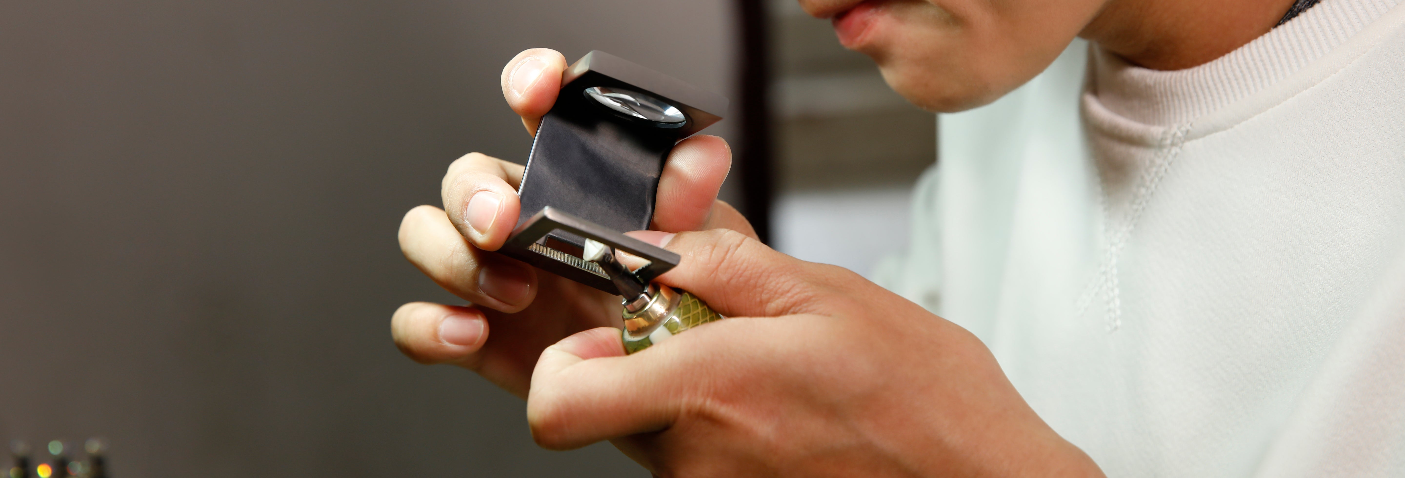 ジュエリーが完成したら、顕微鏡やピンセットを使い、石がしっかり留まっているか、地金が美しく磨かれているか念入りに検品します。
