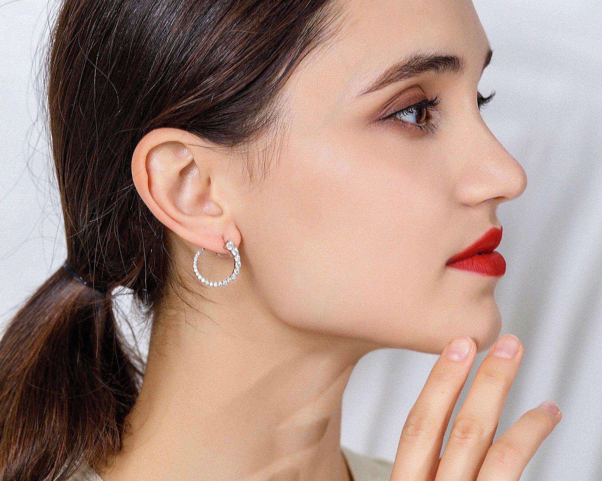 モアサナイト:ラウンドカット片耳約0.8カラット、両耳合計約1.6カラット