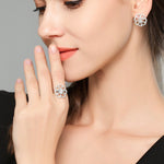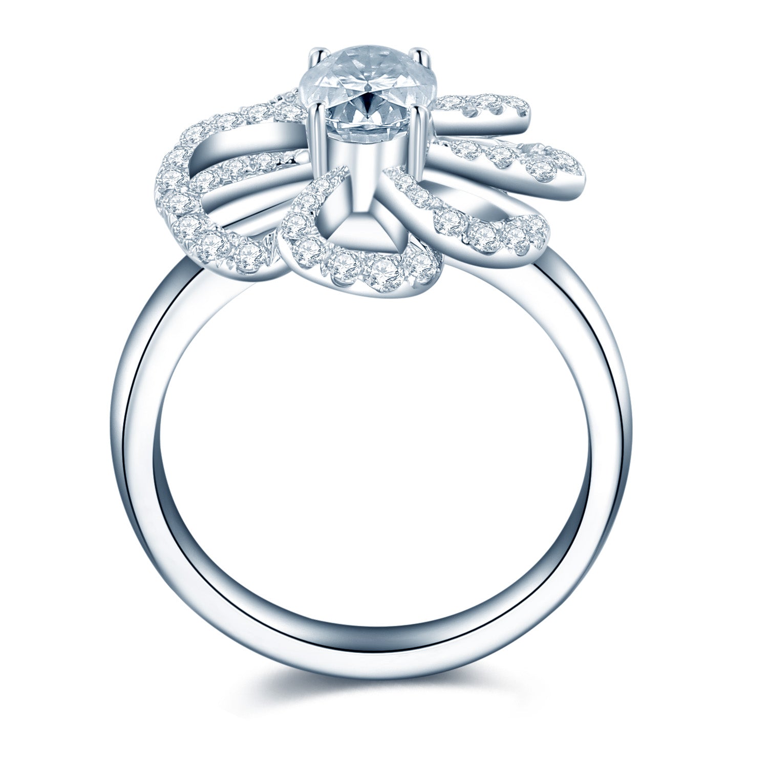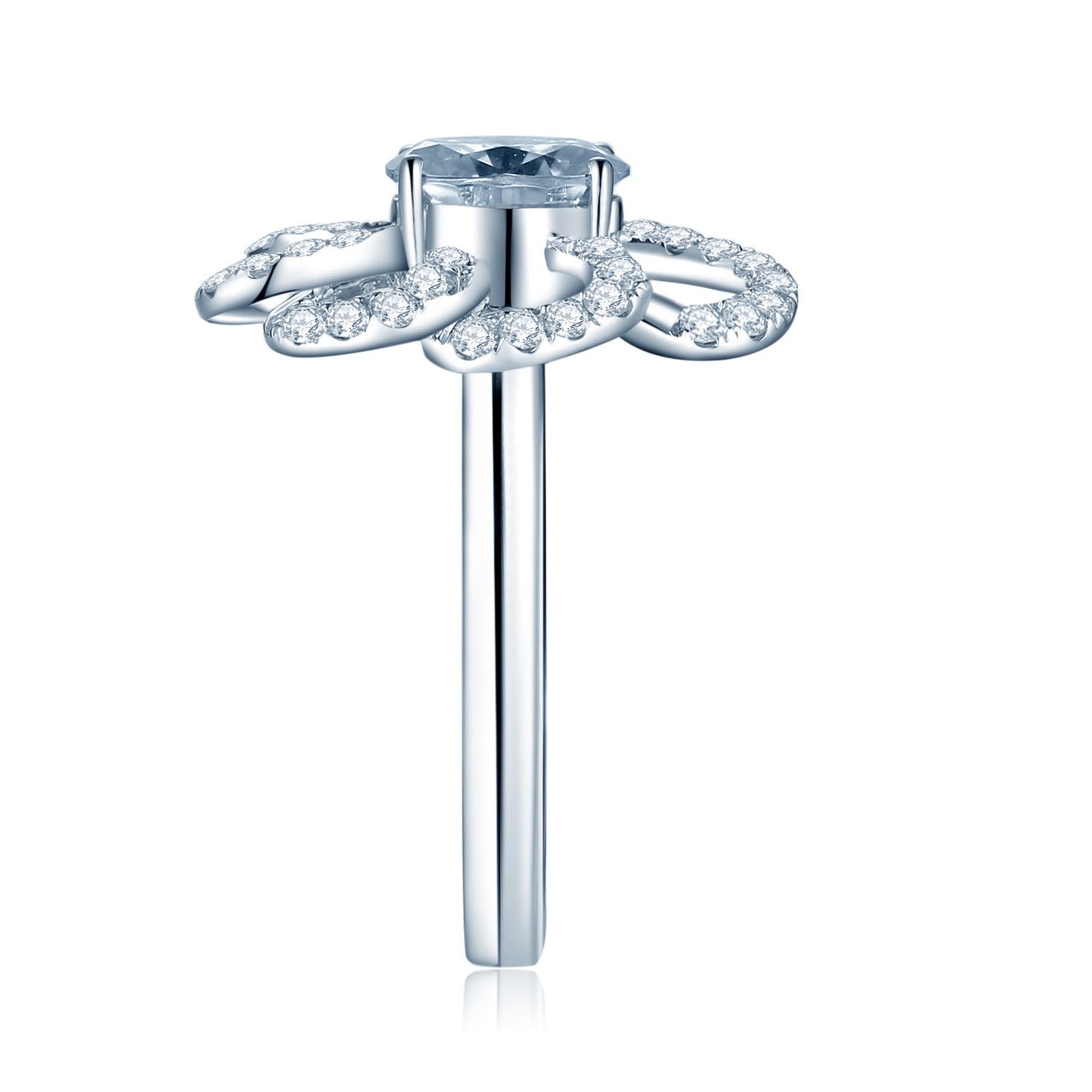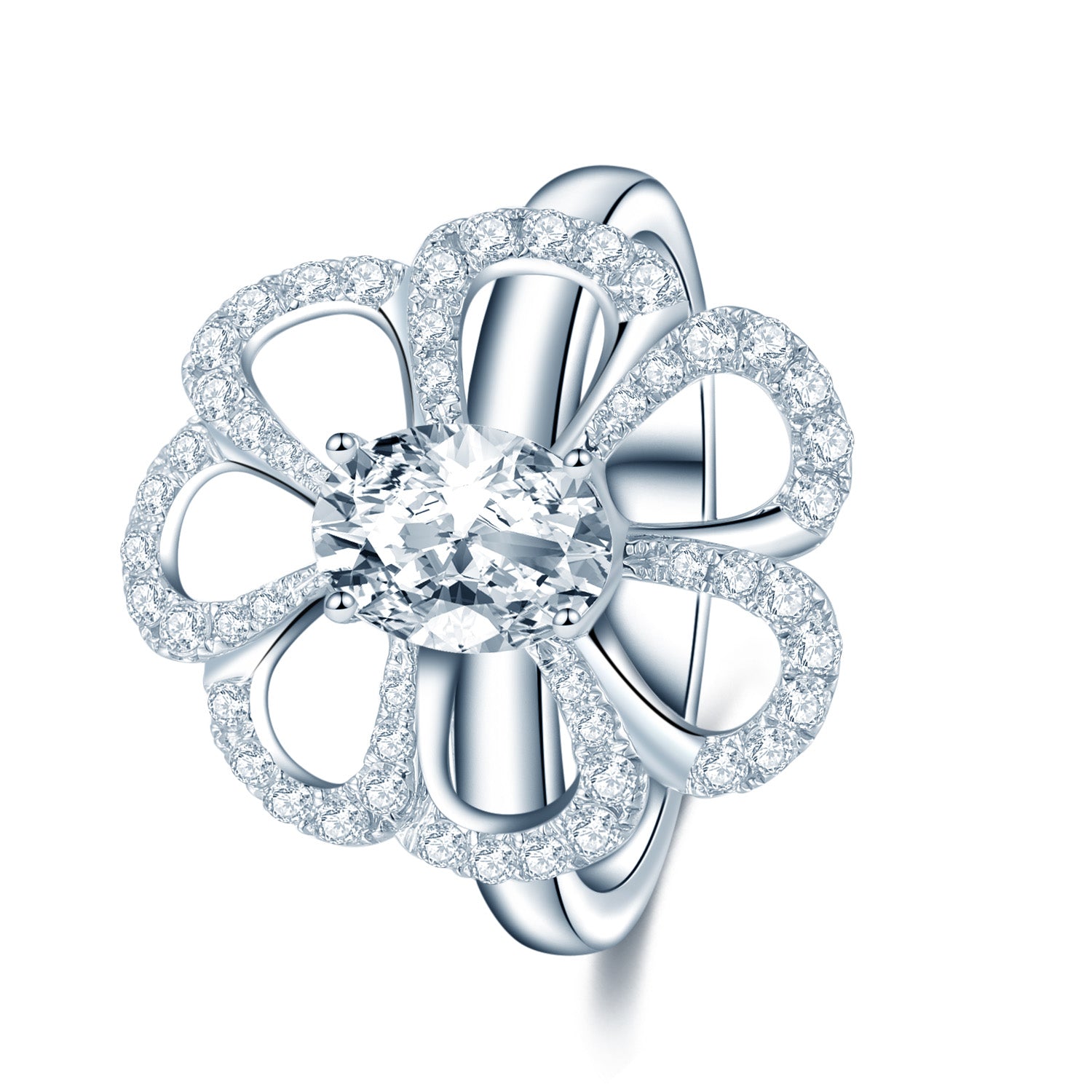 大粒のオーバルセンターストーンをあしらった花のデザイン。横長なシェイプは優しげな印象を醸し出す。透け感のある花びらは一枚ずつ少し異なる形。