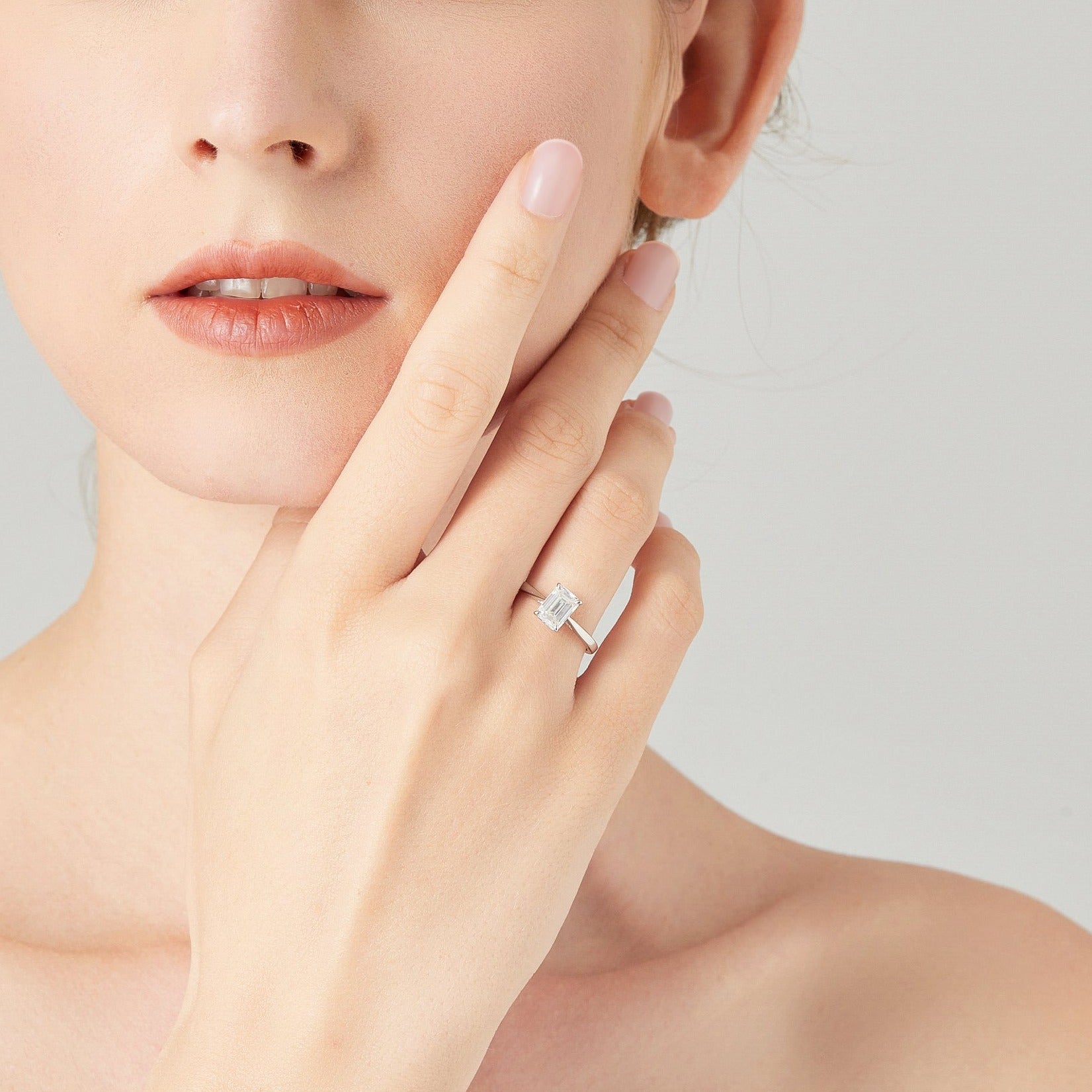センターストーン:エメラルドカット、モアサナイト0.5〜3.0カラットよりお選びいただけます。